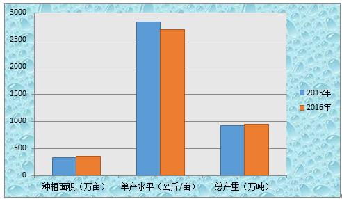圖1 2015年、2016年中國(guó)生姜種植面積、單產(chǎn)水平及總產(chǎn)量
