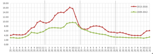 2016年,生姜種植面積穩(wěn)中略增,供給充足,庫(kù)存率補(bǔ)償性增長(zhǎng),消費(fèi)需求穩(wěn)定,整體價(jià)格繼續(xù)低位運(yùn)行,新生姜價(jià)格低開(kāi)高走,年末市場(chǎng)行情略有好轉(zhuǎn)。