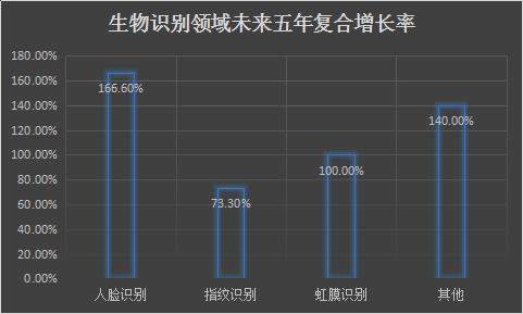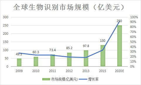 根據國內知名機構測算,人臉識別主要應用領域市場規(guī)模,公安領域16億以上、交通領域50億以上、金融和教育領域分別百億級別。據前瞻網等數據顯示(如圖1、2),全球生物識別市場規(guī)模預計在2020年達到250億美元,人臉識別未來五年復合增長率預計達166.60%,人臉識別作為人工智能模式識別中應用領域最為廣泛的細分行業(yè),伴隨安防、交通等新增市場的打開,預計整體市場規(guī)模有望呈現爆發(fā)式增長。