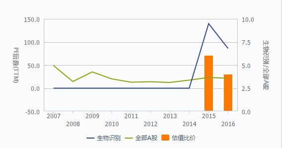 在2014年以前,人臉識別技術所屬的生物識別行業(yè)市盈率PE低于全部A股PE,其值在0附近;2014年至2016年,生物識別行業(yè)PE高于全部A股均值,并在2015年接近150%,被市場看好。