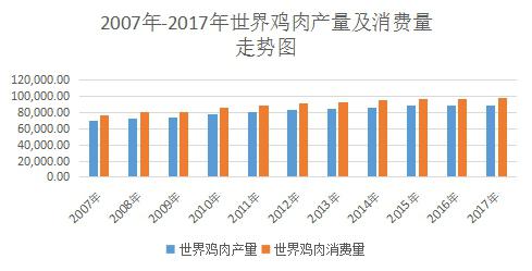 近年來,雞肉產(chǎn)量、銷量呈快速上升趨勢。根據(jù)wind統(tǒng)計數(shù)據(jù),世界雞肉生產(chǎn)量保持穩(wěn)定增長,從2007年的69447千噸,增長到2017年6月的89470千噸,世界雞肉消費量從2007年的76487千噸,增長到2017年6月的98771千噸。