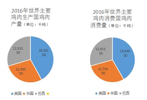 從地區(qū)分布上看,世界前三大雞肉生產(chǎn)和消費國家為美國、中國和巴西。美國為世界雞肉第一大生產(chǎn)國。根據(jù)wind數(shù)據(jù)統(tǒng)計,2016年,美國雞肉生產(chǎn)量達(dá)18261千噸;中國雞肉生產(chǎn)量達(dá)12300千噸;巴西雞肉生產(chǎn)量達(dá)12910千噸。2016年,美國、中國和巴西的雞肉消費量分別為18346千噸、12730千噸和12913千噸。