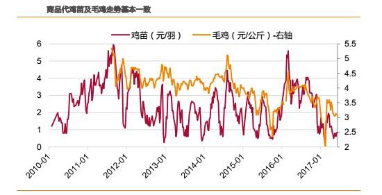引種規(guī)模的下降意味著祖代存欄的下降,供給的減少將導(dǎo)致父母代雞苗銷售價格下降。由于2012年以前國內(nèi)白羽肉雞需求快速增加,因此,國內(nèi)白羽雞引種規(guī)增速的下降也會引起價格的上漲。例如,2010年的引種規(guī)模與2009年基本持平,僅增長3萬套。受此影響,父母代雞苗價格也從2010年9月份開始反彈。同樣的,隨著2014年引種規(guī)模的下降,父母代雞苗價格則從2014年3月見底回升,中間雖有波動,但從2015年10月即開始一輪快速上漲。也就是說,對于祖代產(chǎn)能的變化,父母代雞苗價格是一個重要的驗證指標(biāo)。