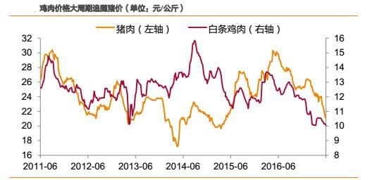 2)短周期內(nèi),受各自供求關(guān)系決定產(chǎn)品價格,則豬價、雞價走勢有可能會發(fā)生背離,但背離時間一般不會超過1個季度,且背離的時間一般出現(xiàn)在春節(jié)后的上半年。如2012年2月-4月,2014年2月-4月、2015 年3月-6月、2016年3月-6月、2017年2月-3月。