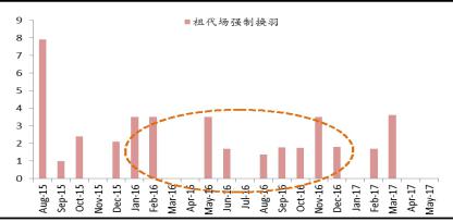 先看祖代存欄情況,我們對于引種量與存欄量之間做出三種情形分析:1)正常的產(chǎn)蛋周期,基本上從引種到淘汰約15個月,則16年3月份開始的引種逐漸進入淘汰期;2)淡季換羽,即在換羽時的雞價一般,通常在50周左右換羽,最終淘汰約在18個月,因此15年12月份開始的引種逐步進入淘汰期;3)旺季換羽,即在換羽時雞價較高,通常在第一產(chǎn)蛋周期結(jié)束后才做換羽,最終淘汰約在21個月,所以15年9月份開始的引種逐步進入淘汰期。