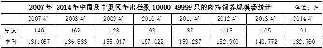 不僅如此,在肉雞飼養(yǎng)場的規(guī)模上也有明顯的差距。據(jù)wind數(shù)據(jù)統(tǒng)計,2014年,寧夏區(qū)內(nèi)肉雞年出欄數(shù)在1-1999只的肉雞飼養(yǎng)規(guī)模場戶數(shù)為133734戶,當(dāng)年全國同規(guī)模的飼養(yǎng)場戶數(shù)高達(dá)21644679戶,占比為0.62%;年出欄數(shù)在2000-9999只的肉雞飼養(yǎng)規(guī)模戶數(shù),寧夏地區(qū)為723戶,全國為258379戶,占比0.28%;年出欄數(shù)在10000-49999只的肉雞飼養(yǎng)規(guī)模戶數(shù),寧夏地區(qū)為91戶,全國為132780戶,占比為0.07%。