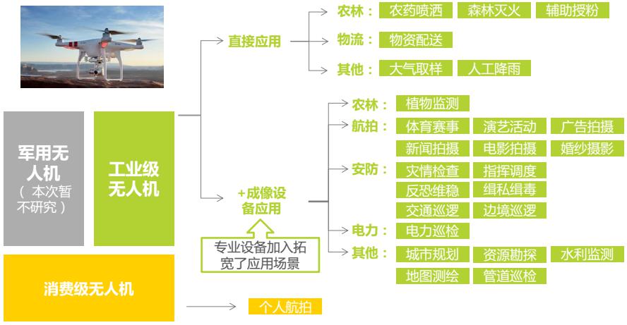 無人機的設(shè)計概念最早應用于軍工領(lǐng)域。由于軍工設(shè)備具有較強的技術(shù)保密和行業(yè)壟斷性質(zhì),民營企業(yè)和資本很難獲得準入。隨著世界范圍內(nèi)軍民融合戰(zhàn)略的實施和推進,近幾年無人機技術(shù)在民用領(lǐng)域的應用獲得長足發(fā)展。根據(jù)無人機應用領(lǐng)域,可分為消費級無人機和工業(yè)級無人機。消費級無人機主要應用于個人航拍,工業(yè)級無人機廣泛應用于農(nóng)業(yè)植保、國土勘測、安防和電力巡檢等領(lǐng)域。