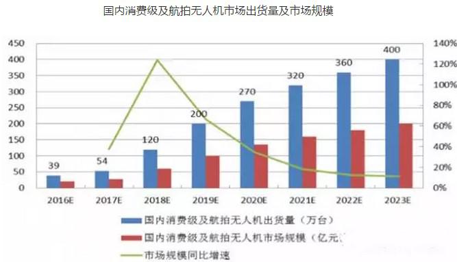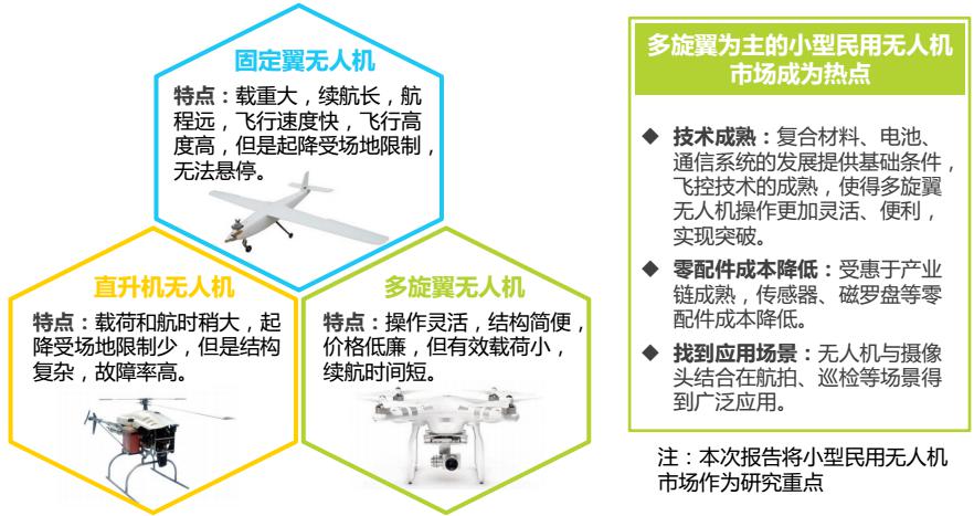隨著技術(shù)成熟,零配件成本降低,并且開發(fā)了航拍、電力巡檢等應用場景,以多旋翼無人機為主的小型民用無人機市場成為熱點。