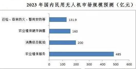 預計到2023年,我國民用無人機各細分應用領(lǐng)域的市場份額分別為:消費級及航拍無人機市場200億元,農(nóng)業(yè)植保硬件銷售160億元,農(nóng)業(yè)植保服務(wù)485億元,巡檢、森林防火、警用安防等領(lǐng)域共計131.9億元,合計976.9億元。