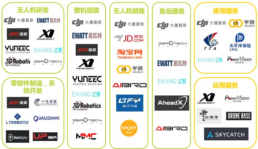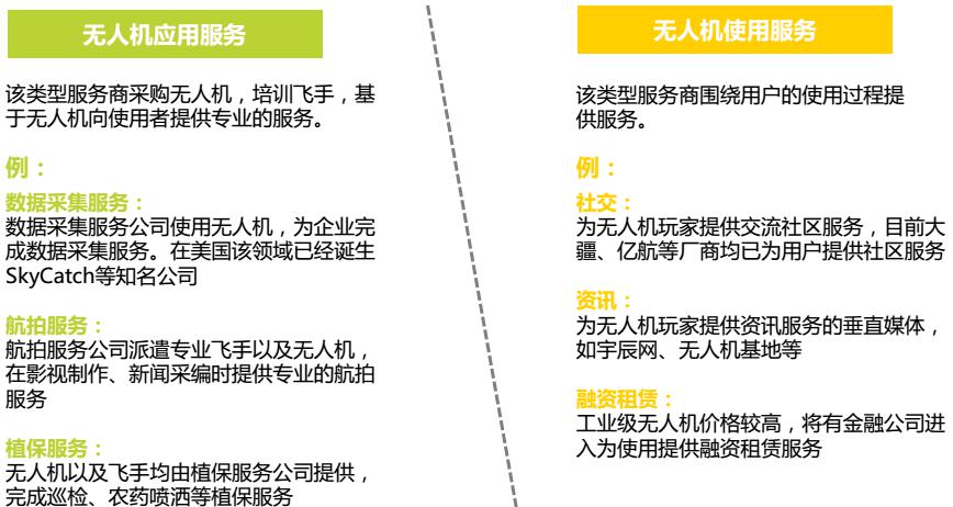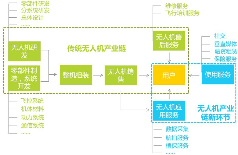 無人機產(chǎn)業(yè)鏈除了傳統(tǒng)的生產(chǎn)制造環(huán)節(jié)外,還出現(xiàn)了針對用戶使用過程的社交、保險以及數(shù)據(jù)采集、航拍等基于應用場景的產(chǎn)業(yè)服務(wù)。