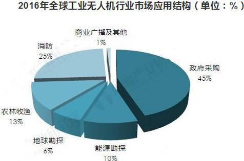 從應用結(jié)構(gòu)來看,當前全球工業(yè)無人機行業(yè)中45%為政府采購,能源勘探和地球勘探的應用占比分別為10%和6%,農(nóng)林牧漁的應用占比約為13%,在消防領(lǐng)域的應用占比達到25%。