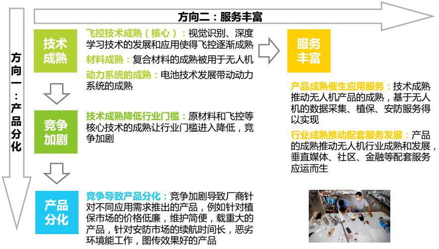 無人機技術(shù)成熟降低了行業(yè)門檻,使得行業(yè)競爭加劇,產(chǎn)品出現(xiàn)分化,技術(shù)和產(chǎn)品的成熟也使得應用和配套服務(wù)越發(fā)豐富。