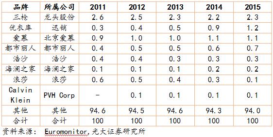 內(nèi)衣作為消費者的第二層“肌膚”,消費者對內(nèi)衣的消費比其他成衣具備更強的忠誠度,進入 21 世紀(jì)后,消費者對內(nèi)衣品牌的認(rèn)可也越來越強。 雖然部分品牌由于品牌老化導(dǎo)致市占率降低,但是總體看,前 16 家女士內(nèi)衣品牌的市場份額從 2011 年的 13.9%提升到了 2015 年的 15%。前八大男士內(nèi)衣品牌的市占率從 5.4%提升到 6%。