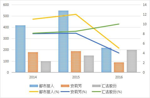 都市麗人發(fā)布的2016年業(yè)績報告顯示,公司實現(xiàn)收入45.12億元人民幣,同比下跌8.9%。股東應(yīng)占利潤2.41億元,同比下跌55.2%。