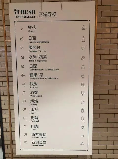 如上圖所示,不同于盒馬鮮生面積小、以海鮮為主的特點(diǎn),7fresh總面積超過4000平米,涉及品類廣泛,包括鮮花、日百、快餐、烘焙、海鮮、肉類等。