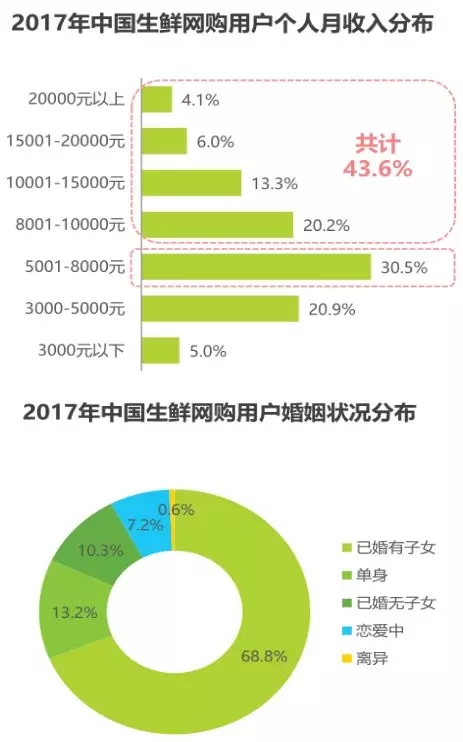 從用戶屬性來看,體驗(yàn)過創(chuàng)新模式的用戶中高學(xué)歷、高家庭月收入的人群占比均高于整體生鮮網(wǎng)購(gòu)用戶,與創(chuàng)新模式中高端消費(fèi)者的定位相吻合。體驗(yàn)過創(chuàng)新模式的用戶中78.2%擁有大學(xué)本科及以上學(xué)歷,80.7%的用戶家庭月收入在10000元以上,其中家庭月收入在10001-15000元的用戶最多,占比達(dá)28.2%。