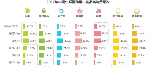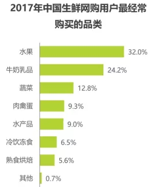 3、生鮮網(wǎng)購(gòu)仍以水果為主品類,高頻剛需引流作用明顯。