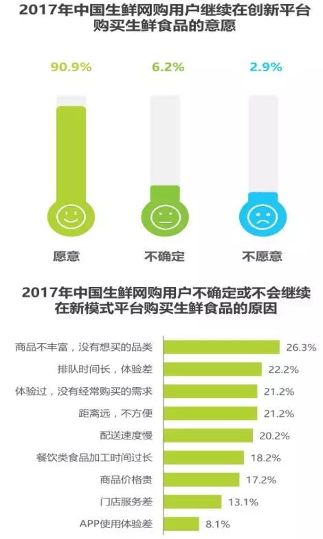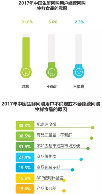 九成以上用戶愿意繼續(xù)網(wǎng)購(gòu)生鮮食品,配送速度慢和品質(zhì)問題是用戶不確定或不會(huì)繼續(xù)購(gòu)買的主因。