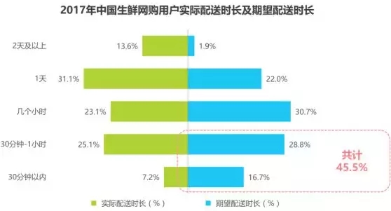 用戶期待更快速的配送體驗(yàn),45.5%的用戶希望配送時(shí)長(zhǎng)在1小時(shí)內(nèi)。