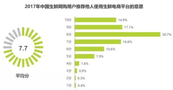 生鮮網(wǎng)購(gòu)用戶推薦他人使用的意愿較強(qiáng),整體推薦意愿的平均分為7.7分。30.7%的用戶推薦他人使用的意愿為8分,17.1%的用戶推薦他人使用的意愿為9分,14.9%的用戶推薦他人使用的意愿為10分。