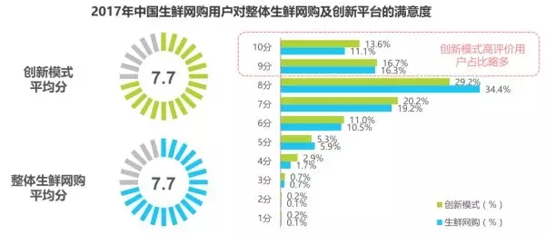 用戶對(duì)創(chuàng)新模式整體較為滿意,滿意度與整體生鮮網(wǎng)購(gòu)基本持平,高評(píng)價(jià)用戶占比略多。