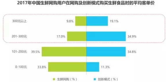 從消費(fèi)金額來看,用戶在創(chuàng)新模式消費(fèi)的單均價(jià)明顯高于生鮮網(wǎng)購(gòu)整體,超過50%的用戶在創(chuàng)新模式消費(fèi)的單均價(jià)超過200元。其中,19.1%的用戶在創(chuàng)新模式消費(fèi)單均價(jià)超300元,而這一比例在整體生鮮網(wǎng)購(gòu)平臺(tái)僅9.8%。34.9%的用戶在創(chuàng)新模式的客單價(jià)在201-300元之間,僅有17.0%的整體生鮮網(wǎng)購(gòu)用戶客單價(jià)在這一區(qū)間。
