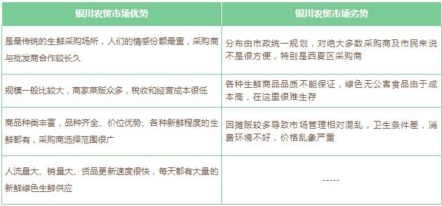在銀川本地,主城范圍內(nèi)除最早建立的北環(huán)批發(fā)市場(chǎng)外,再?zèng)]有專業(yè)的大型生鮮批發(fā)市場(chǎng),近幾年發(fā)展起來的有:四季鮮果蔬批發(fā)市場(chǎng)、21世紀(jì)冷鏈批發(fā)市場(chǎng)、海吉星農(nóng)副產(chǎn)品物流園、潤(rùn)恒農(nóng)產(chǎn)品市場(chǎng)等都在郊區(qū)。大型農(nóng)產(chǎn)品交易市場(chǎng)是傳統(tǒng)生鮮流通中不可缺少的一環(huán),是各社區(qū)農(nóng)貿(mào)市場(chǎng)及超市生鮮尤其是蔬菜水果的主要來源,具有成交量大、知名度高、社會(huì)影響大、流通體系健全、配套完整等優(yōu)勢(shì),但也存在傳統(tǒng)生鮮流通方式的不足。