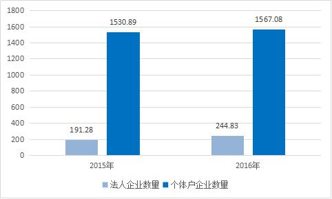 截至2016年底我國零售業(yè)經(jīng)營單位共有1811.91萬個,同比增長5.2%。其中,法人企業(yè)單位數(shù)量為244.83萬個,同比增長28%,占全部經(jīng)營單位比重為13.5%,比上年提升2.4個百分點(diǎn);個體工商戶數(shù)量1567.08萬個,同比增長2.4%,占全部經(jīng)營單位比重為86.5%。