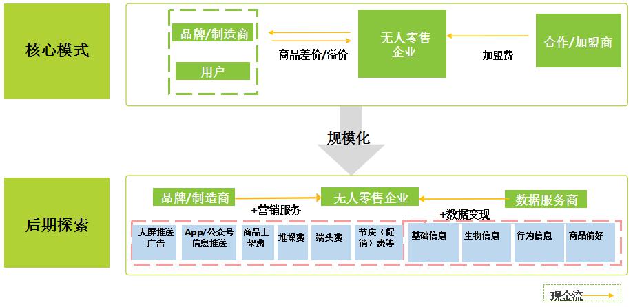 無人零售企業(yè)收入來源以銷售商品賺取差價為主,并且通過規(guī)?;岣咦h價能力降低采購成本。此外,從加盟商獲取加盟費(fèi)用的商業(yè)模式也已經(jīng)開始推行。無人零售發(fā)展至中后期,企業(yè)數(shù)據(jù)更為龐大,其盈利模式將隨之產(chǎn)生更多的想象空間,以互聯(lián)網(wǎng)思路開展?fàn)I銷服務(wù)、數(shù)據(jù)變現(xiàn)等都是比較成熟的可參考模式。