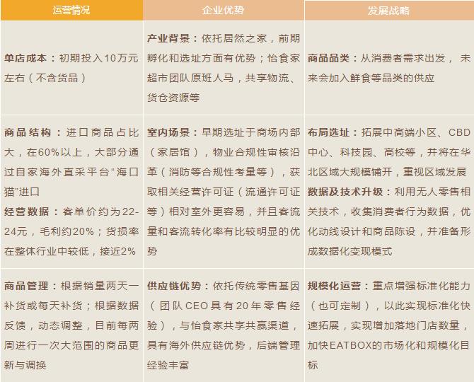 EATBOX由居然之家于2017年7月推出,定位于中高端小區(qū)、高校、CBD及科技園等。EATBOX 首店面積約30平米,設(shè)有9個貨架、2臺冰柜,主要銷售零食、飲料酒水、日化等商品,SKU約600~700個,進(jìn)口商品SKU約400個。