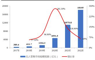 據(jù)艾媒咨詢預(yù)測,2017年我國無人零售商店交易額預(yù)計(jì)為389.4 億元,未來五年無人零售商店將會迎來發(fā)展紅利期,2020年的預(yù)計(jì)增長率可達(dá)281.3%,至2022年市場交易規(guī)模將超過1.8萬億元。同時,艾媒咨詢預(yù)計(jì),2017年我國無人零售商店的用戶規(guī)模僅為600萬人,未來五年用戶規(guī)模將大幅增長,至2022年可達(dá)2.45億人。