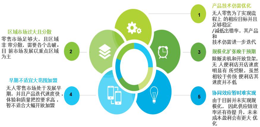 無人零售市場整體看好,但發(fā)展仍受到一定困阻典型優(yōu)質(zhì)企業(yè)能夠起到很好的示范作用,整體無人零售市場有發(fā)展前景。但目前來看,不容忽視的是市場剛剛經(jīng)歷一年左右的發(fā)展,還處于前期探索階段,因此還存在一些比較共性的發(fā)展困阻,主要集中在產(chǎn)品技術(shù)優(yōu)化、區(qū)域市場拓展、企業(yè)規(guī)模化發(fā)展、企業(yè)開放加盟和供應(yīng)鏈的協(xié)同效應(yīng)。