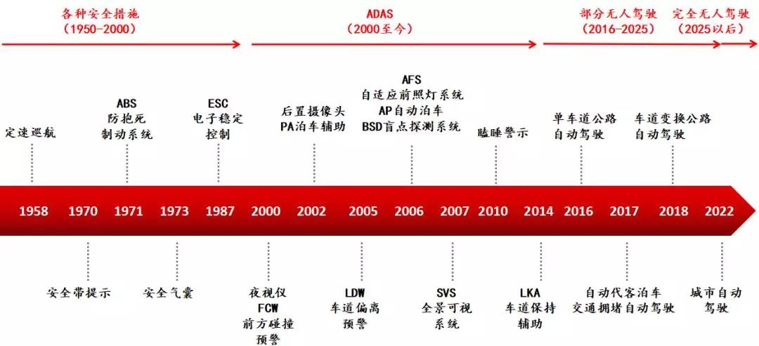 無人駕駛技術(shù)最初的發(fā)展從減少、防止機動車事故開始。從1950年至2000年,OEM車廠和Tier 1的零部件制造商對車輛發(fā)明、生產(chǎn)了許多結(jié)構(gòu)性的改進(jìn)。最核心的就是四大安全系統(tǒng):安全帶,防抱死制動系統(tǒng)(ABS),安全氣囊和電子穩(wěn)定控制(ESC)。