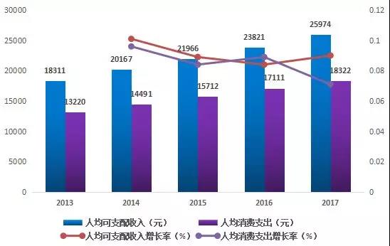 2013-2017年中國(guó)居民人均可支配收入和消費(fèi)支出