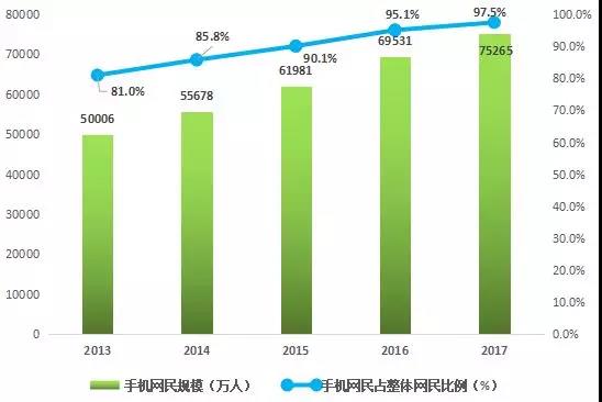 2013-2017年中國(guó)手機(jī)網(wǎng)民數(shù)量及其整體網(wǎng)民比例